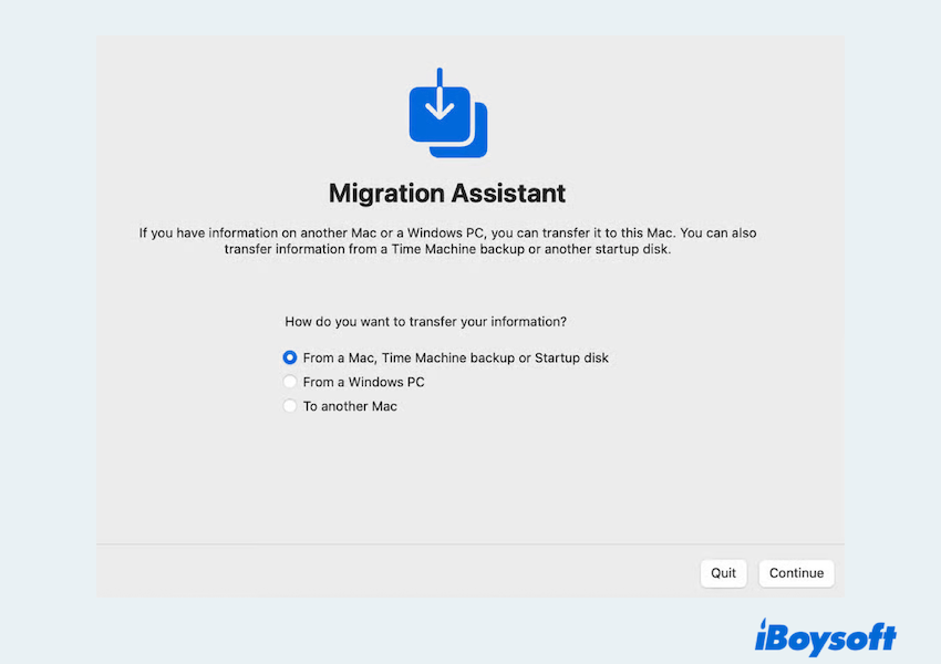 - Befolgen Sie die Bildschirmanweisungen, um Daten aus der Time Machine-Sicherung, der Startfestplatte oder einem anderen Mac zu übertragen.