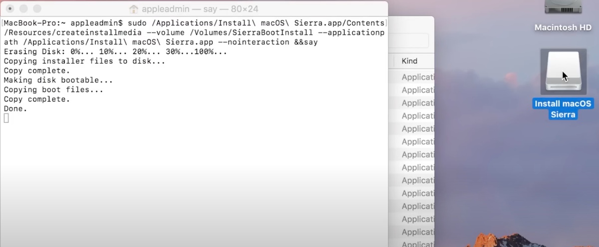 sudo /Applications/Install\ macOS\ Sierra.app/Contents/Resources/createinstallmedia --volume /Volumes/MyVolume --applicationpath /Applications/Install\ macOS\ Sierra.app --nointeraction(Das Bild unten fügt den &&say Befehl hinzu, der nicht entscheidend für das Erstellen des Boot-Laufwerks ist.)