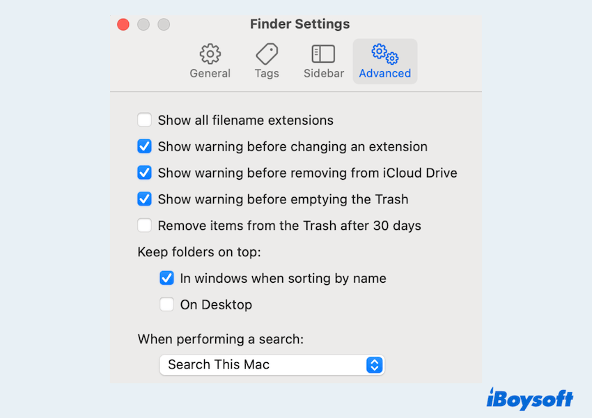 Systemweite Finder-Einstellungen können individuelle Dateieinstellungen außer Kraft setzen, beispielsweise dass Sie die Dateierweiterungen auf Mac nicht ausblenden können.
