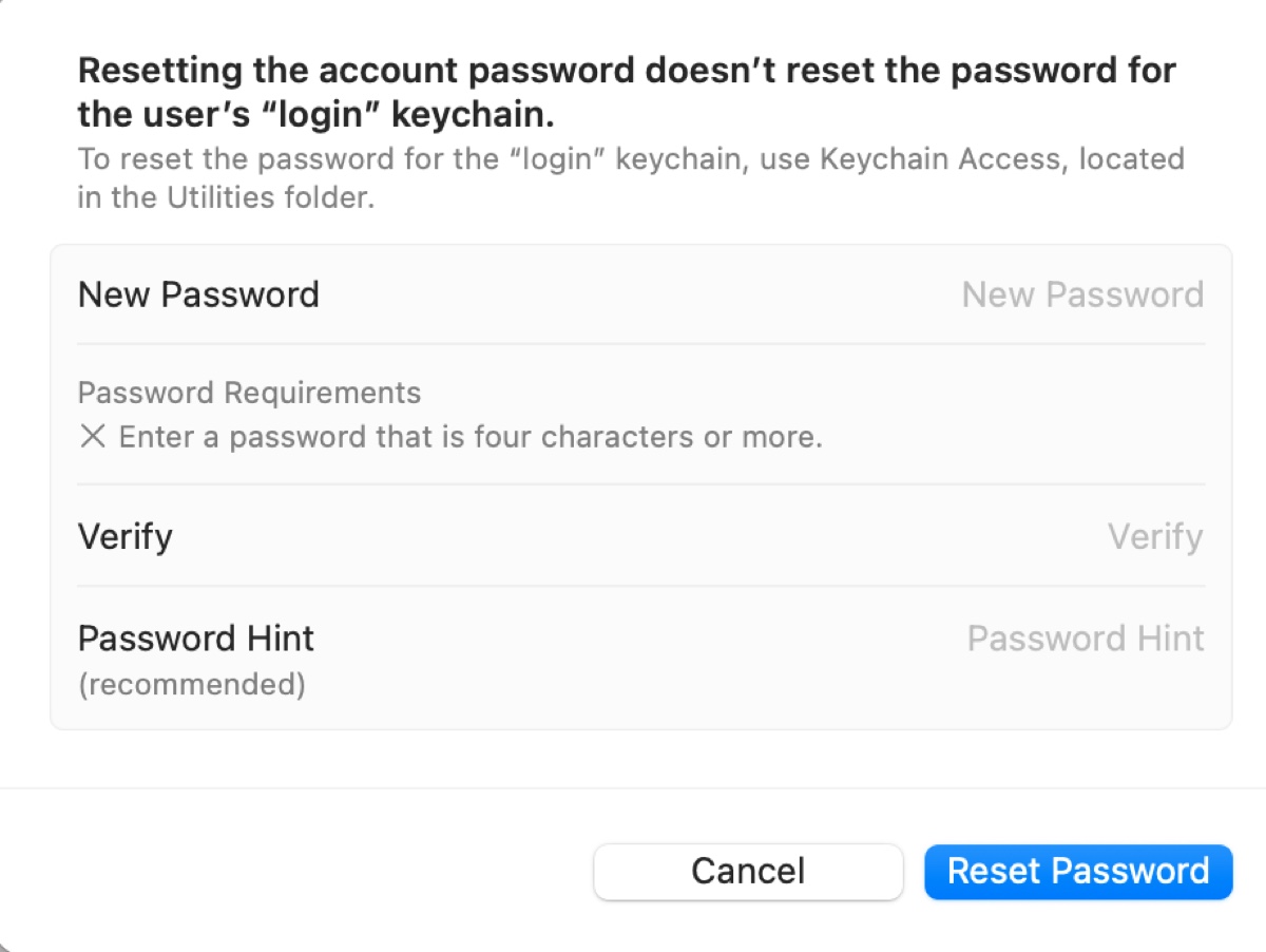 Dies ist nur verfügbar, wenn Sie die Option "Benutzern erlauben, das Passwort mit dem Apple-Konto zurückzusetzen" in den Systemeinstellungen (früher Systemeinstellungen) > Benutzer & Gruppen aktiviert haben.