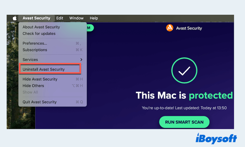 - Abre Avast Security, luego haz clic en Avast Security en el menú de Apple y elige Desinstalar Avast Security.
