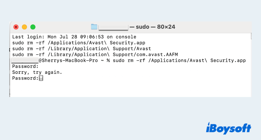 Puedes aplicar comandos de Terminal de Mac para eliminar archivos de Avast Antivirus a nivel del sistema después de eliminarlos en Finder, pero ten cuidado al usarlos, ya que un pequeño error puede llevar a resultados terribles: