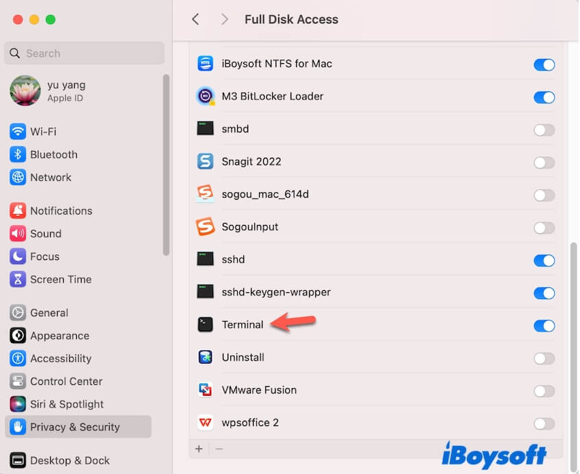 Si alguna vez has desactivado el Acceso Completo al Disco para Terminal, no podrá acceder ni modificar algunos archivos y directorios protegidos para crear un instalador USB de macOS.