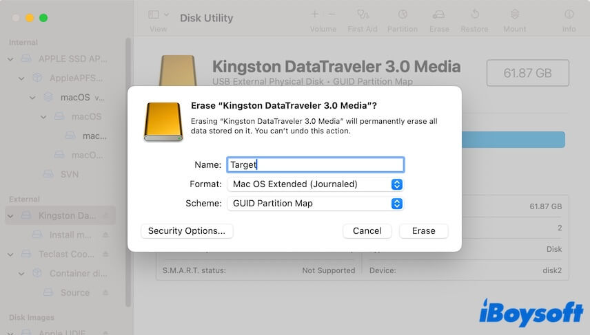 Por lo tanto, ve a Utilidad de Discos para verificar el formato del disco USB y reformatearlo si no está formateado correctamente.