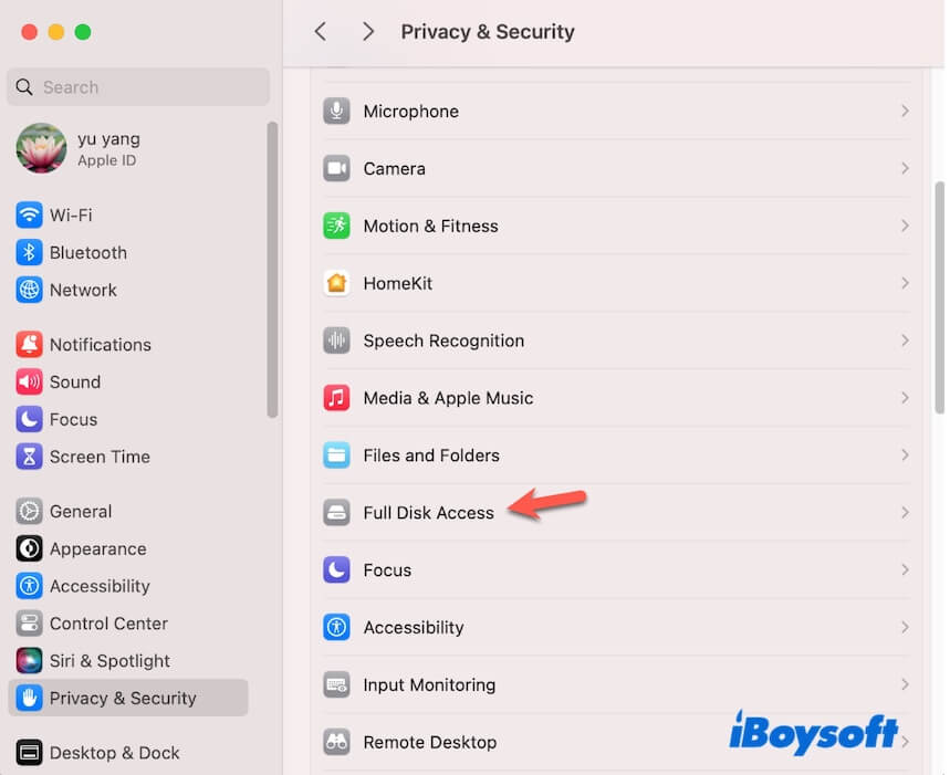 - Haz clic en el menú de Apple > Preferencias del Sistema > Privacidad y Seguridad > Acceso Completo al Disco.