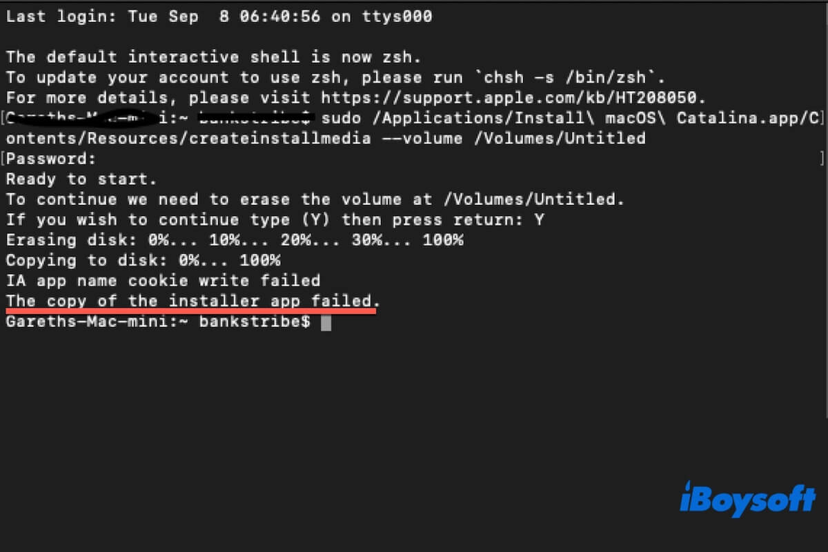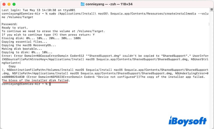 Si tu disco externo no está conectado firmemente a tu Mac, tu toque accidental o golpe puede hacer que el disco se desconecte de tu Mac. En consecuencia, la creación del instalador de arranque falla con "La copia de la aplicación del instalador falló" en Terminal. O, es posible que veas "La bendición del disco del instalador falló", como se muestra a continuación.