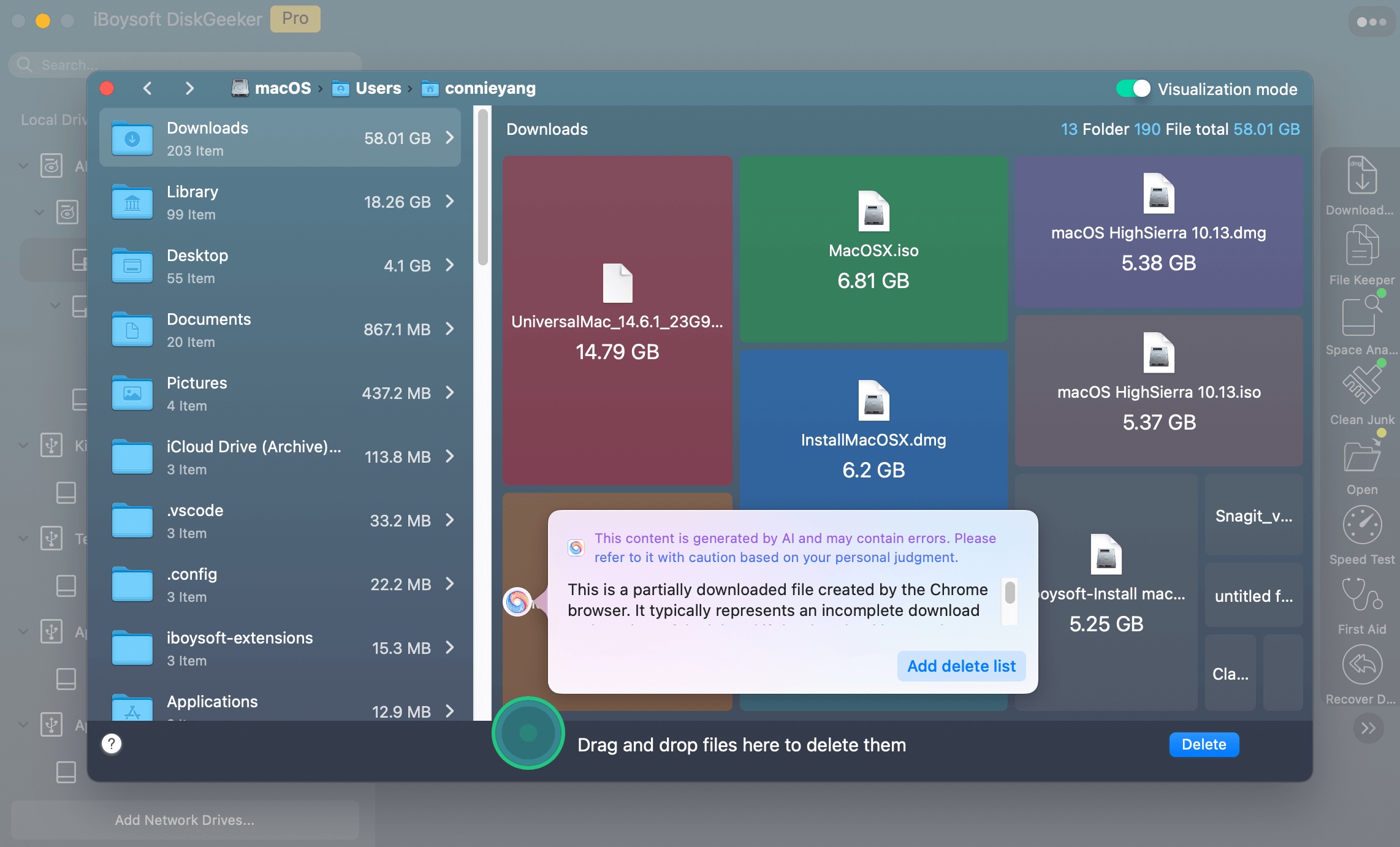 La falta de espacio también puede provocar errores de actualización de macOS 15.7. Si su Mac no tiene mucho espacio libre, use iBoysoft DiskGeeker para eliminar archivos innecesarios y basura. Es una herramienta versátil de gestión de disco que le ayuda a encontrar y eliminar archivos no deseados en un Mac.