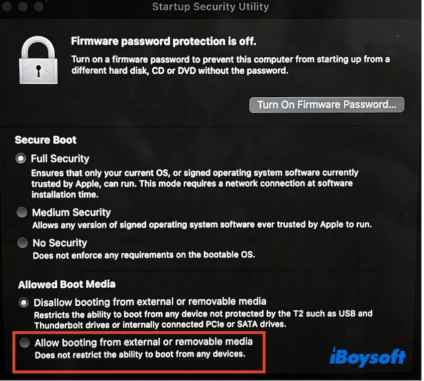 Si lo tiene, debes cambiar la configuración en Utilidad de Seguridad de Inicio para permitir que tu Mac arranque desde un medio de arranque externo.