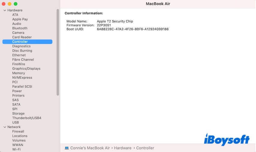 Para verificar si tu Mac tiene la seguridad T2, mantén presionada la tecla Opción y haz clic simultáneamente en Menú de Apple > Información del sistema, luego selecciona Controlador bajo Hardware.
