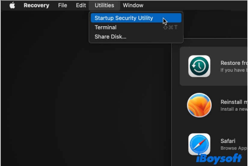 - Selecciona Utilidades desde la barra de menú > Utilidad de Seguridad de Arranque.