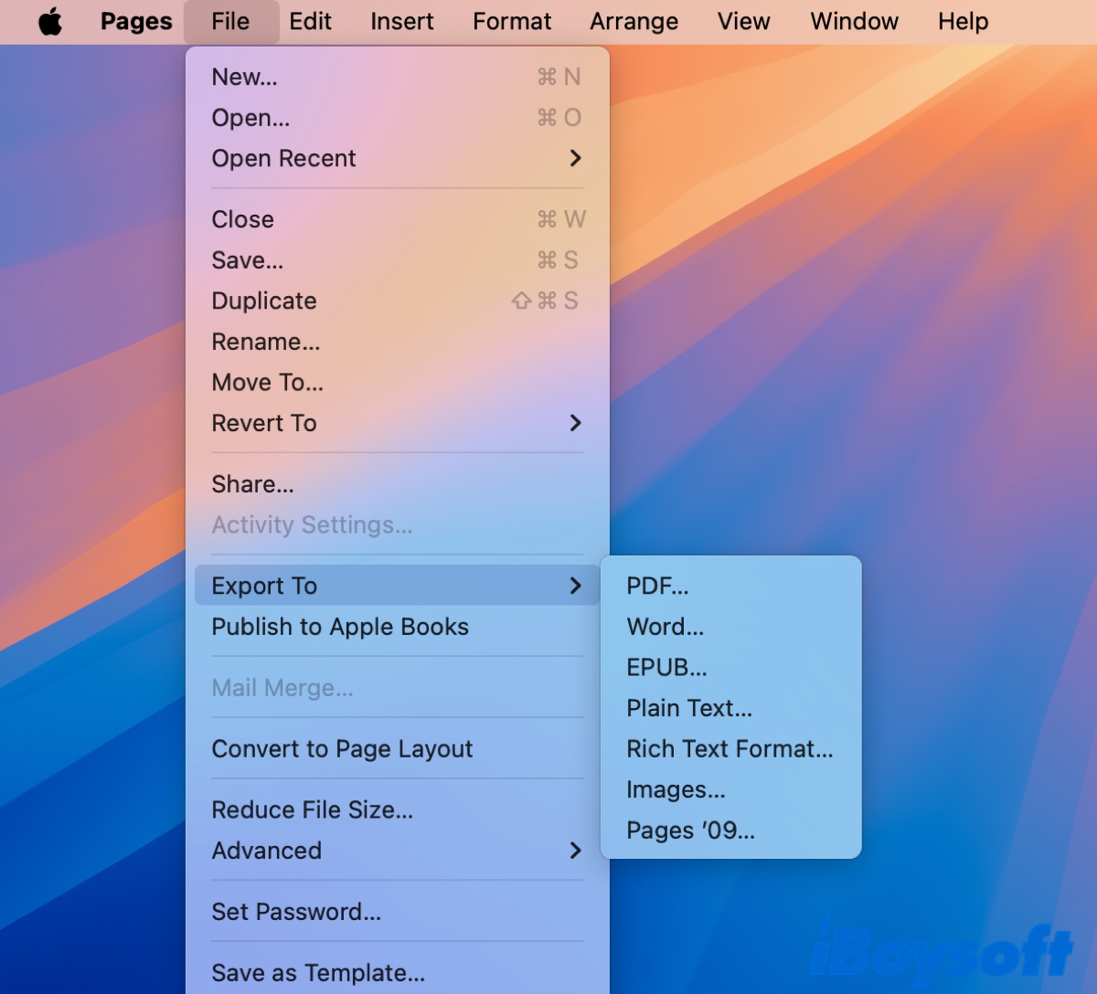 Par exemple, pour enregistrer des pages sur Mac en PDF, choisissez Fichier > Exporter vers, puis choisissez PDF parmi les formats disponibles.