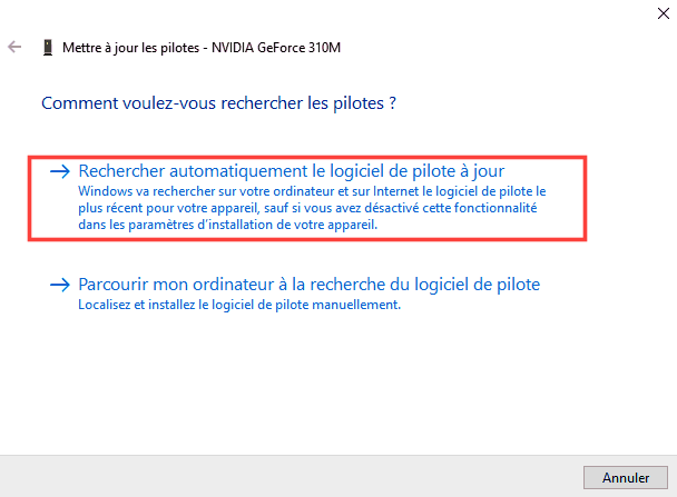 - Si ce n'est pas le cas, faites un nouveau clic droit. Sélectionnez Mettre à jour le pilote puis cliquez sur Rechercher automatiquement de pilote mis à jour.
