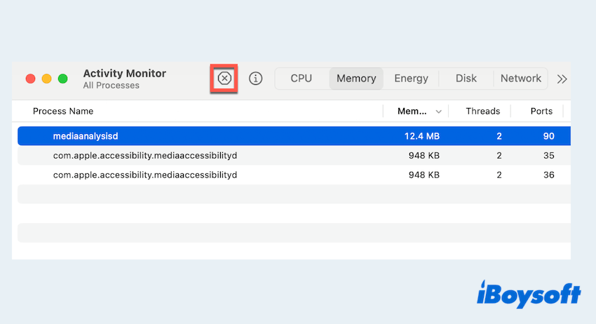 - Utilisez Monitor d'activité pour forcer la fermeture (si bloqué) : Ouvrez Monitor d'activité > Recherchez mediaanalysisd > Sélectionnez et cliquez sur le "X" pour forcer la fermeture.