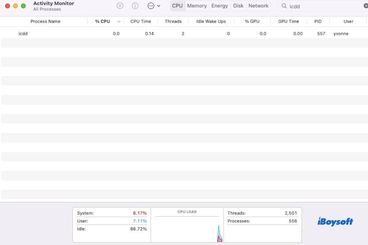 Dans ces cas, vous pouvez remarquer le processus icdd dans Monitor d'activité utilisant un CPU excessif, parfois jusqu'à 100%, ce qui peut ralentir votre Mac, augmenter l'activité du ventilateur et causer un décalage noticeable.