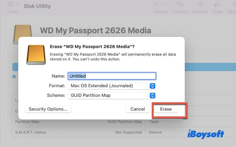 - Click the Erase button at the top. Select Mac OS Extended (Journaled) as the Format section, GUID Partition Map as the Scheme section. Then click Erase to begin formatting the drive.