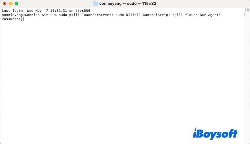 - Enter the command below to close the three background processes of Touch Bar. sudo pkill TouchBarServer; sudo killall ControlStrip; pkill "Touch Bar Agent"