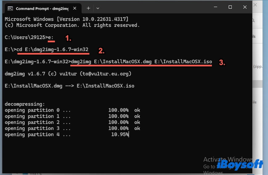 dmg2img を使用して Windows で DMG を ISO に変換する方法は以下のとおりです: