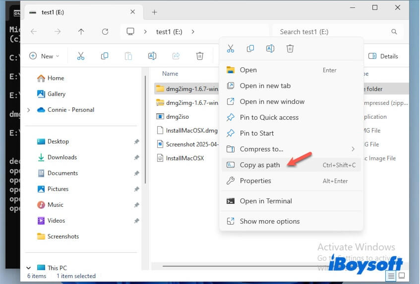 - .dmg ファイルを .iso ファイルに変換するために以下のコマンドを入力してください。 dmg2img \path\to\example.dmg \path\to\example.isoここで、\path\to\example.dmg を実際の DMG ファイルのパスに、\path\to\example.iso を ISO ファイルを保存したい場所に置き換えてください。DMG ファイルを右クリックしてパスをコピーできます。