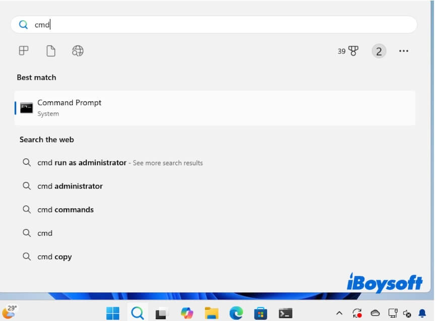 - 検索バーに cmd と入力し、管理者としてコマンドプロンプトを実行してください。