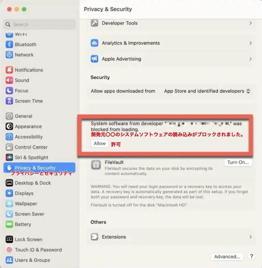 macOS VenturaおよびmacOS Sonomaでシステム拡張機能をロードする許可: