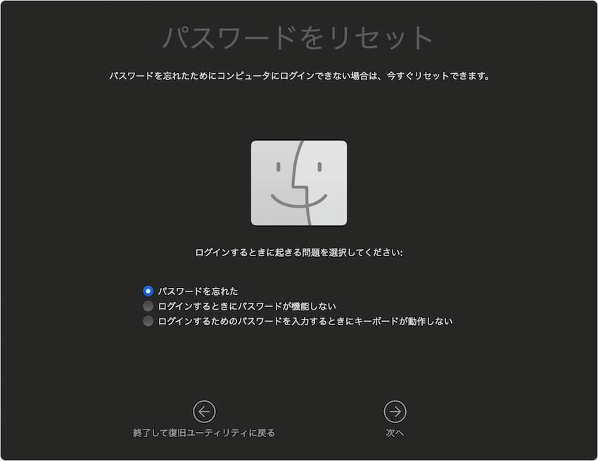 メッセージが表示された場合、[電源ボタンを押して Mac をシャットダウンし、再び起動して macOS リカバリモードにブート] というメッセージに従い、[パスワードリセット] ウィンドウが表示されます。