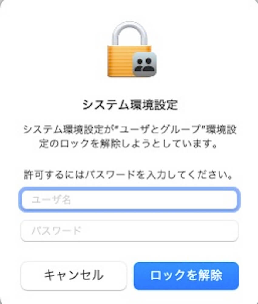 - ロックアイコンをクリックし、管理者名とパスワードを入力します。