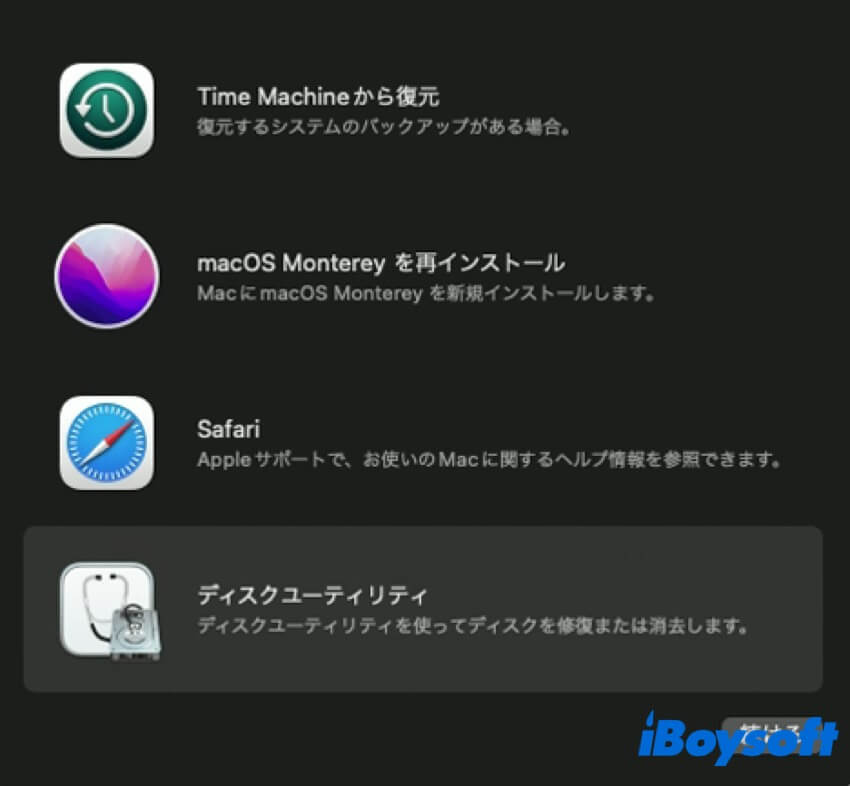 これを使うと、Macでディスクの検証、OSの再インストール、起動セキュリティの変更など、基本的なトラブルシューティングと回復活動を行うことができます。