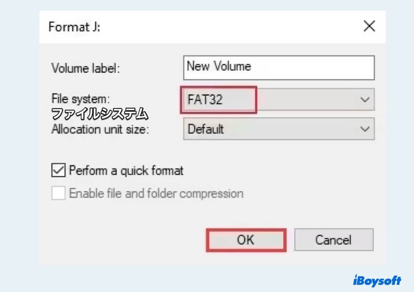 - ファイルシステムとしてFAT32を選択し、「OK」をクリックすると、フォーマット処理が開始されます。