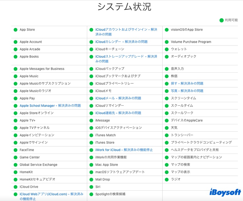 iCloud がグレーアウトしている原因が Apple のサーバーにあるかどうかを特定するために、Apple のシステムステータスページにアクセスし、iCloud 関連サービスが利用可能かどうかを確認できます。特定の iCloud サービスがダウンしている場合は、しばらく待つと通常に戻るはずです。