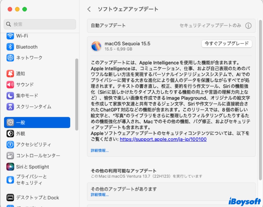 デバイスが最新の iOS/macOS を実行していない場合は、まず Mac の Apple メニュー > システム設定 > 一般 > ソフトウェアアップデートから最新バージョンにシステムをアップデートし、iPhone の設定 > 一般 > ソフトウェア からも同じように行うことができます。