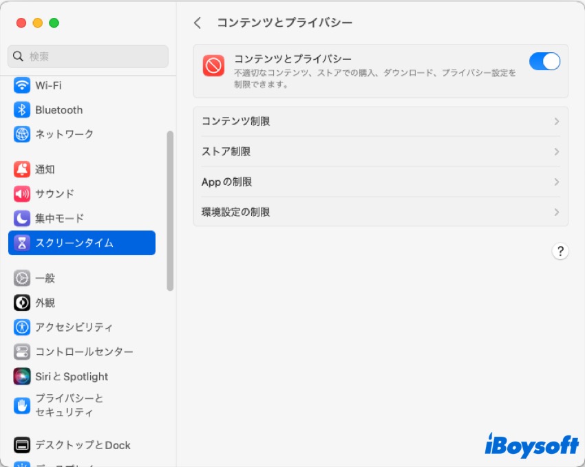 アクティブなコンテンツとプライバシー制限: コンテンツとプライバシー制限を使用することで不適切なコンテンツをブロックできます。ただし、iCloud アカウントの使用を妨げる可能性もあります。