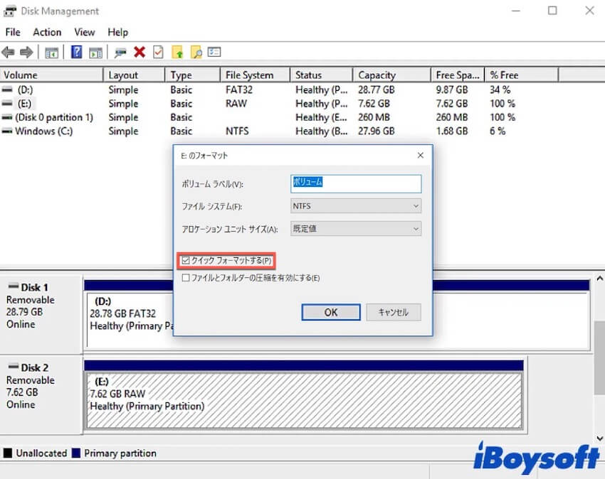 - 対応するファイルシステムを選択し、「クイックフォーマットする」をクリックします。