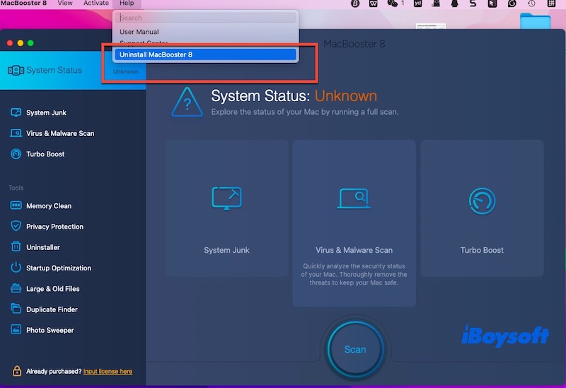 - No menu suspenso, selecione Desinstalar MacBooster.
