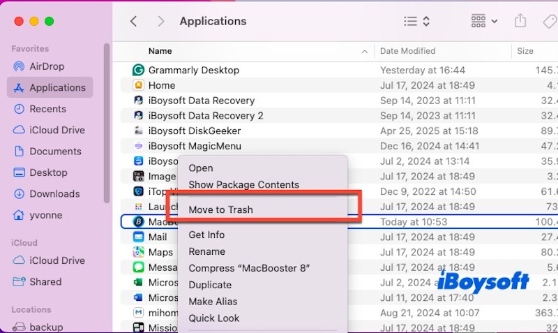 - Abra Finder > Aplicativos, localize MacBooster.app e clique com o botão direito para movê-lo para a Lixeira.