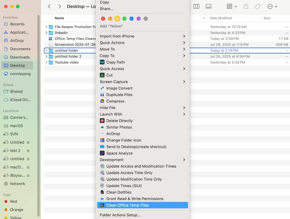 Além disso, você pode clicar com o botão direito em qualquer uma de suas pastas frequentemente usadas e usar a opção Limpar Arquivos Temporários do Office no menu de clique direito do iBoysoft MagicMenu para verificar e limpar os arquivos temporários do Office.