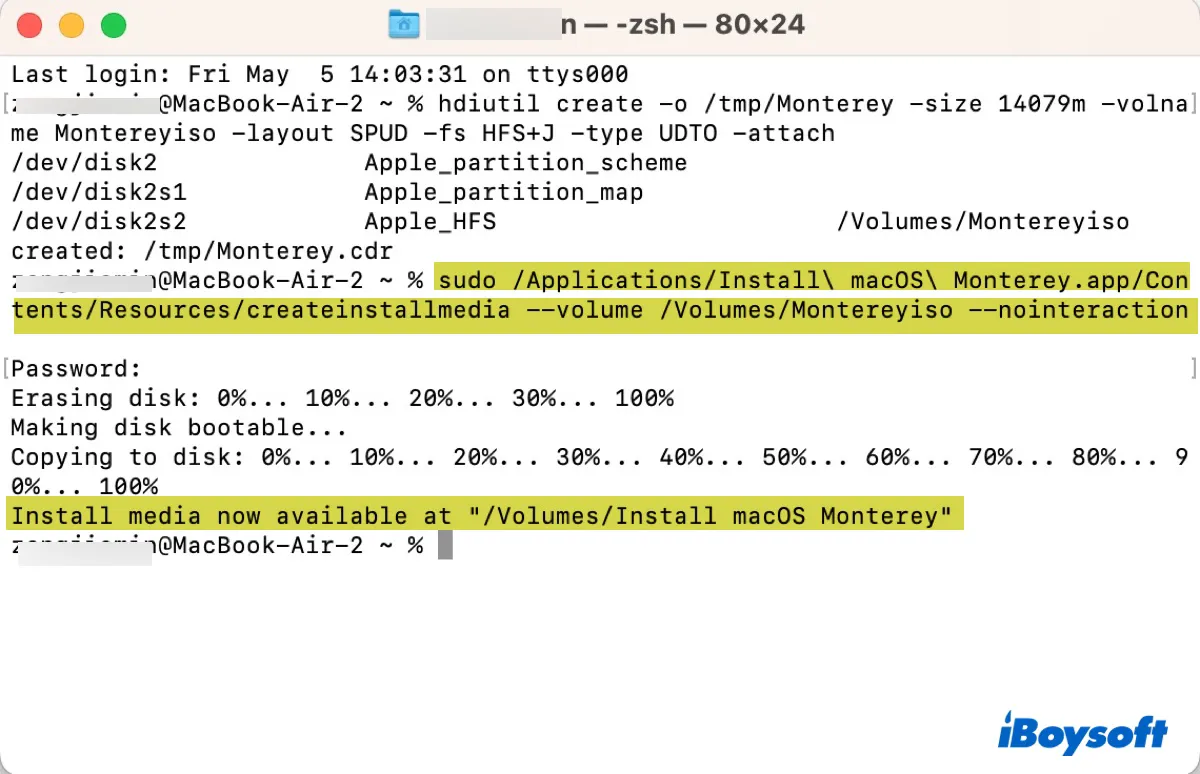 - No Terminal, execute o comando a seguir.sudo /Applications/Install\ macOS\ Monterey.app/Contents/Resources/createinstallmedia --volume /Volumes/Montereyiso --nointeraction