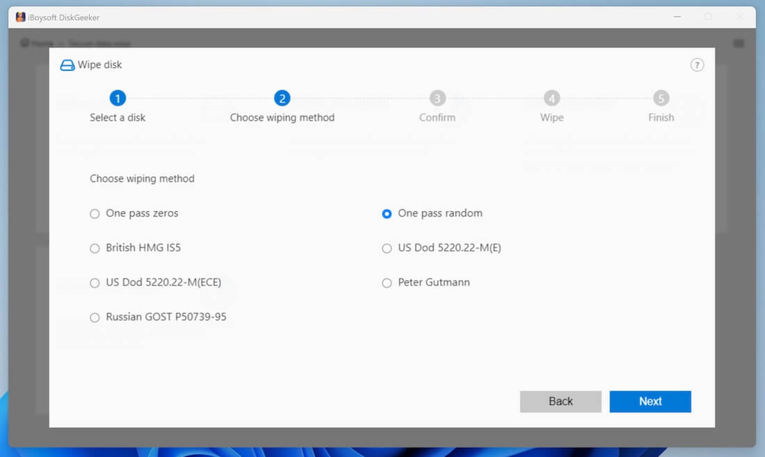 Como um software seguro de limpeza de disco, ele segue as regras de proteção da privacidade do usuário e não causará nenhuma corrupção em seu disco durante a eliminação de dados. Além disso, considerando suas necessidades de segurança, o iBoysoft DiskGeeker oferece 7 métodos de eliminação de dados, a saber, um passe de zeros, um passe aleatório, British HMG IS5, US Dod 5220.22- M(E), US Dod 5220.22-M(ECE), Peter Gutmann e Russian GOT P50739-95. O iBoysoft DiskGeeker para Windows também é altamente compatível. Ele suporta Windows 11, 10, 8.1, 8, 7 e Windows Server 2022, 2019, 2016, 2012, 2008.