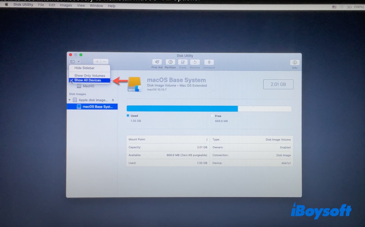 - Clique em Visualizar > Mostrar todos os dispositivos para revelar o disco físico.