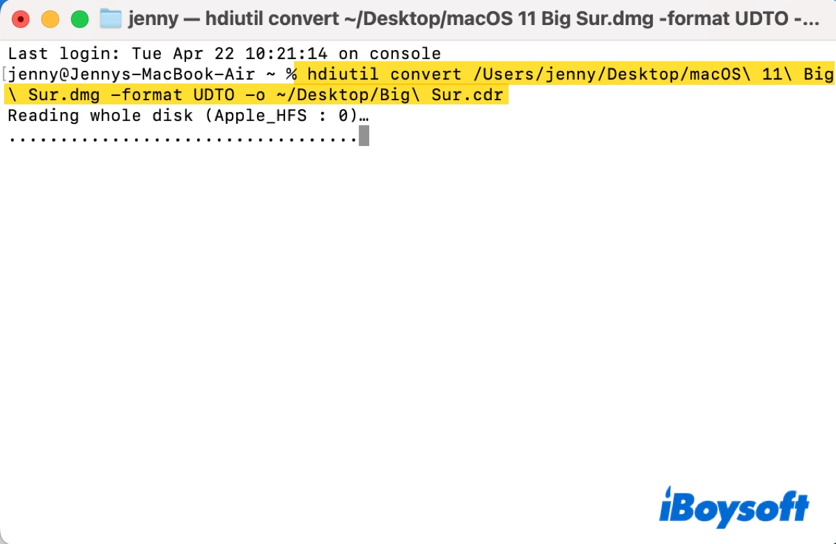 Por fim, você deve converter a imagem de disco do macOS Big Sur de .cdr para .iso e movê-la da pasta /tmp para sua área de trabalho.