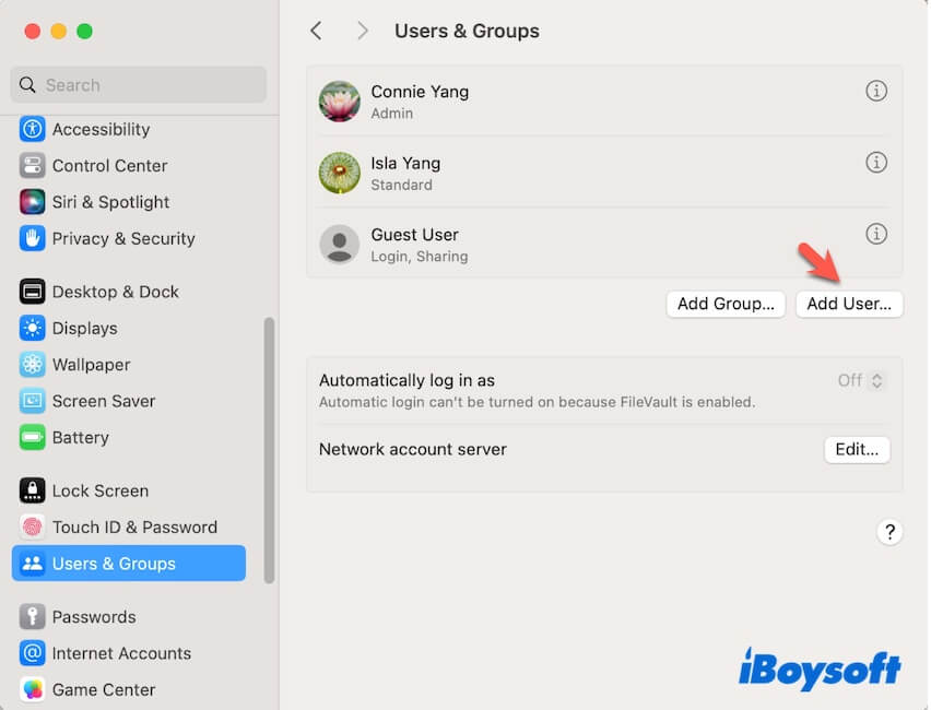 - Clique no menu da Apple > Preferências do Sistema > Utilizadores e Grupos.