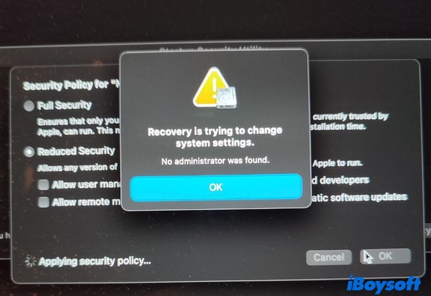 Alguns usuários afirmam que também encontram o erro "É necessária a interação do usuário" ou "A recuperação está tentando alterar as configurações do sistema. Nenhum administrador foi encontrado." ao executar o comando para desativar csrutil no Terminal para desativar o SIP ou alterar as configurações nos utilitários de segurança de inicialização no Modo de Recuperação.