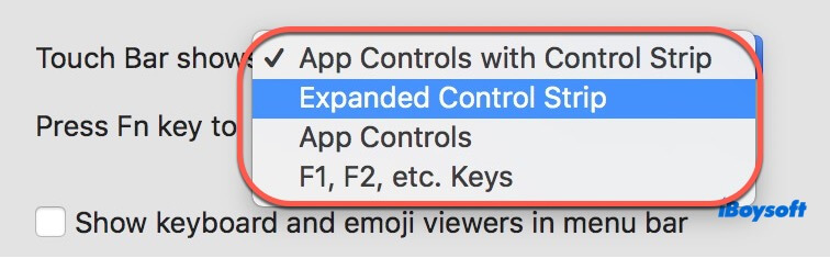 - No menu suspenso "Touch Bar shows", certifique-se de que está definido como "Controles de Aplicativos" ou "Faixa de Controle Expandida."