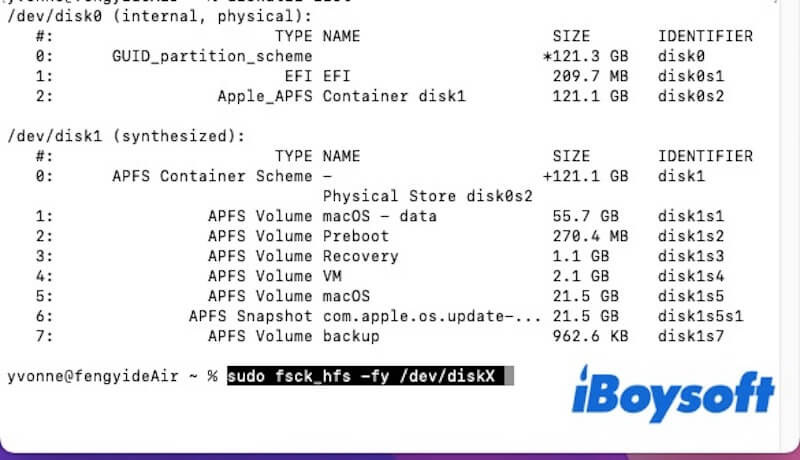Nota: Em casos raros, pode ser necessário executar o comando fsck em Modo Seguro ou Modo de Recuperação se o disco não puder ser reparado em modo normal.
