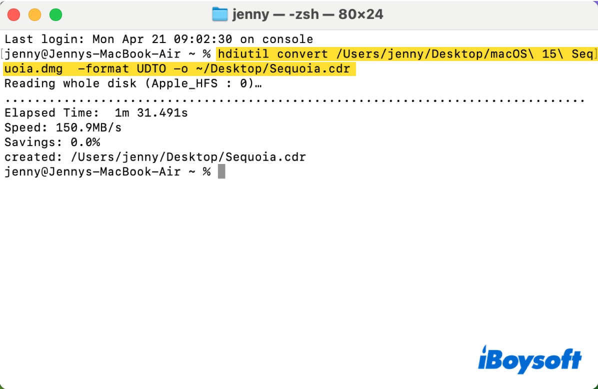 hdiutil dönüştür yazın, bir boşluk bırakın, sonra .dmg dosyasını Terminal'e sürükleyin ve bırakın, dosya yolunu almak için bir boşluk bırakın, sonra -format UDTO -o ~/Desktop/xxx.cdr'yi Terminal'e kopyalayın ve yapıştırın, Enter'a basın. Son komut şuna benzer olabilir: hdiutil dönüştür /Users/jenny/Desktop/macOS\ 15\ Sequoia.dmg -format UDTO -o ~/Desktop/Sequoia.cdr - 6. .cdr dosyasını .iso dosyasına yeniden adlandırın.mv cdr_file_path ~/Desktop/Sequoia.iso