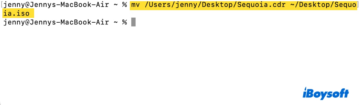 mv yazın, bir boşluk bırakın, sonra .cdr dosyasını Terminal'e sürükleyin ve bırakın, dosya yolunu almak için bir boşluk bırakın, sonra ~/Desktop/xxx.iso yazın ve Enter'a basın. Son komut şuna benzer olabilir: mv /Users/jenny/Desktop/Sequoia.cdr ~/Desktop/Sequoia.iso - 7. Masaüstünüzde macOS ISO dosyasını bulun.