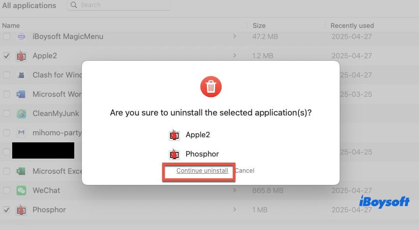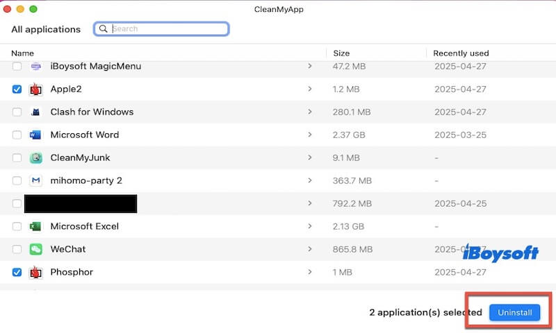 Ayrıca, CleanMyApp bir profesyonel kaldırma aracıdır, bu nedenle sisteminizde çok fazla yer kaplayacağından endişelenmenize gerek yoktur. Aynı zamanda toplu kaldırma desteği sunar, böylece kaldırmak istediğiniz birden fazla uygulamayı seçebilir ve hepsini bir seferde kaldırmak için "Kaldır"ı tıklayabilirsiniz.