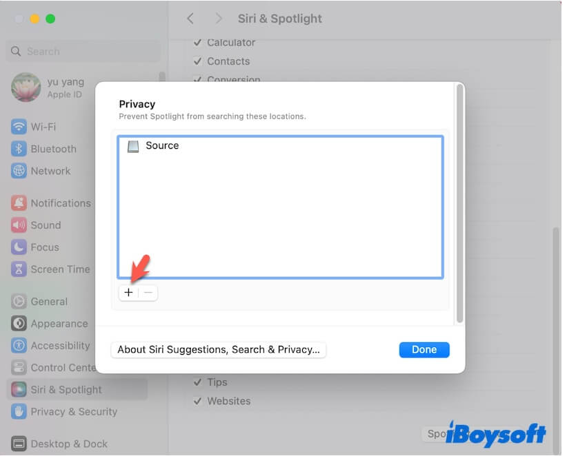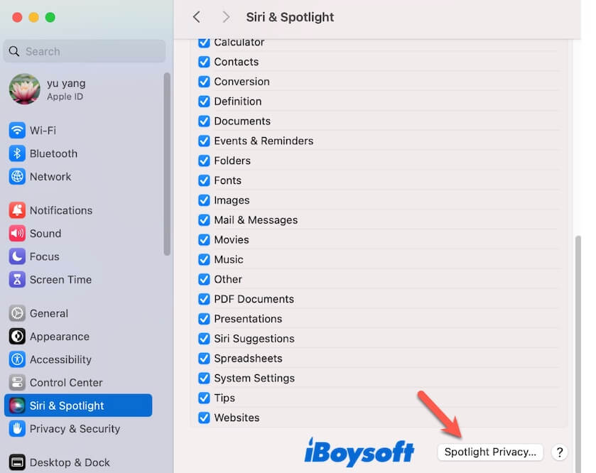 - Apple menüsüne tıklayın > Sistem Ayarları > Siri & Spotlight > Spotlight Gizlilik.