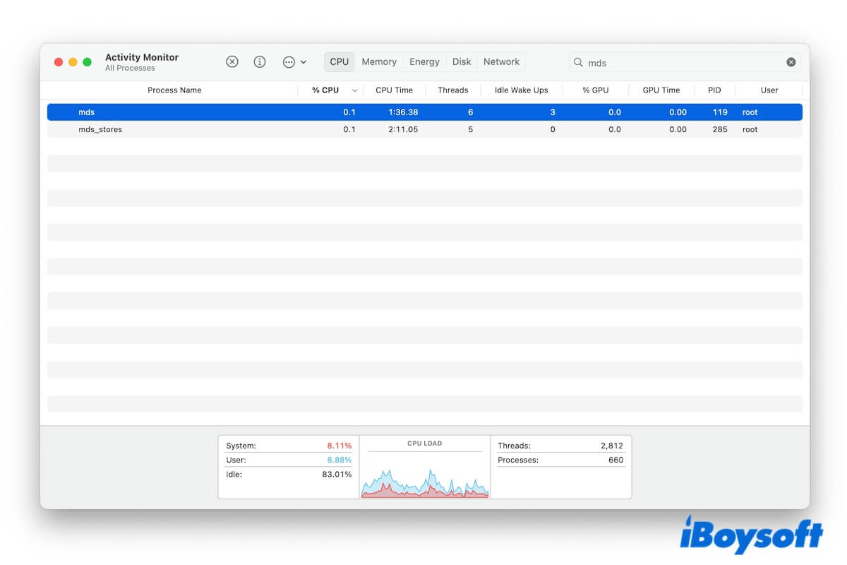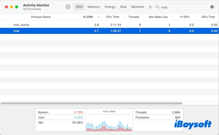 Activity Monitor'da, Spotlight ile ilgili bir diğer benzer adı olan mds_stores adlı başka bir süreci görebilirsiniz. Her ikisi de Spotlight ile ilgilidir, ancak birbirinden biraz farklı amaçlara hizmet ederler.