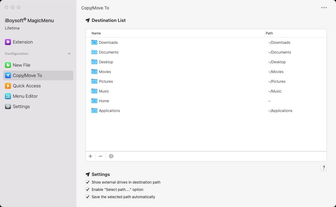 (Alle Mac-Bibliotheksordner werden als Standardpfade angezeigt, Sie können den Pfad im Kopieren/Verschieben nach-Menü abwählen oder hinzufügen)