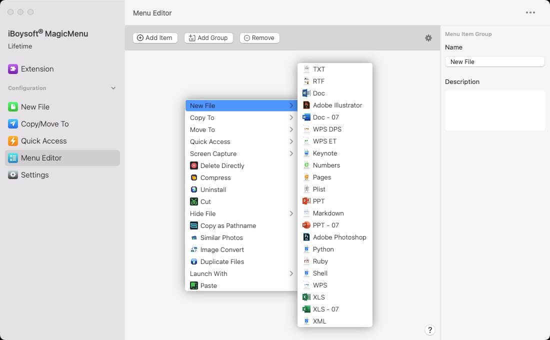 Como todos sabemos, não há criação de novos arquivos ou recortar e colar no menu de contexto do clique direito no Mac. Se você quiser gerenciar ou organizar seus arquivos no Mac de forma mais fácil e eficaz, é melhor utilizar o iBoysoft MagicMenu, uma ferramenta leve projetada para personalizar e aprimorar seu menu de contexto de clique direito no Mac.